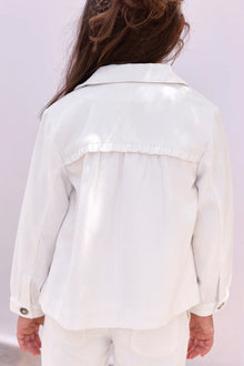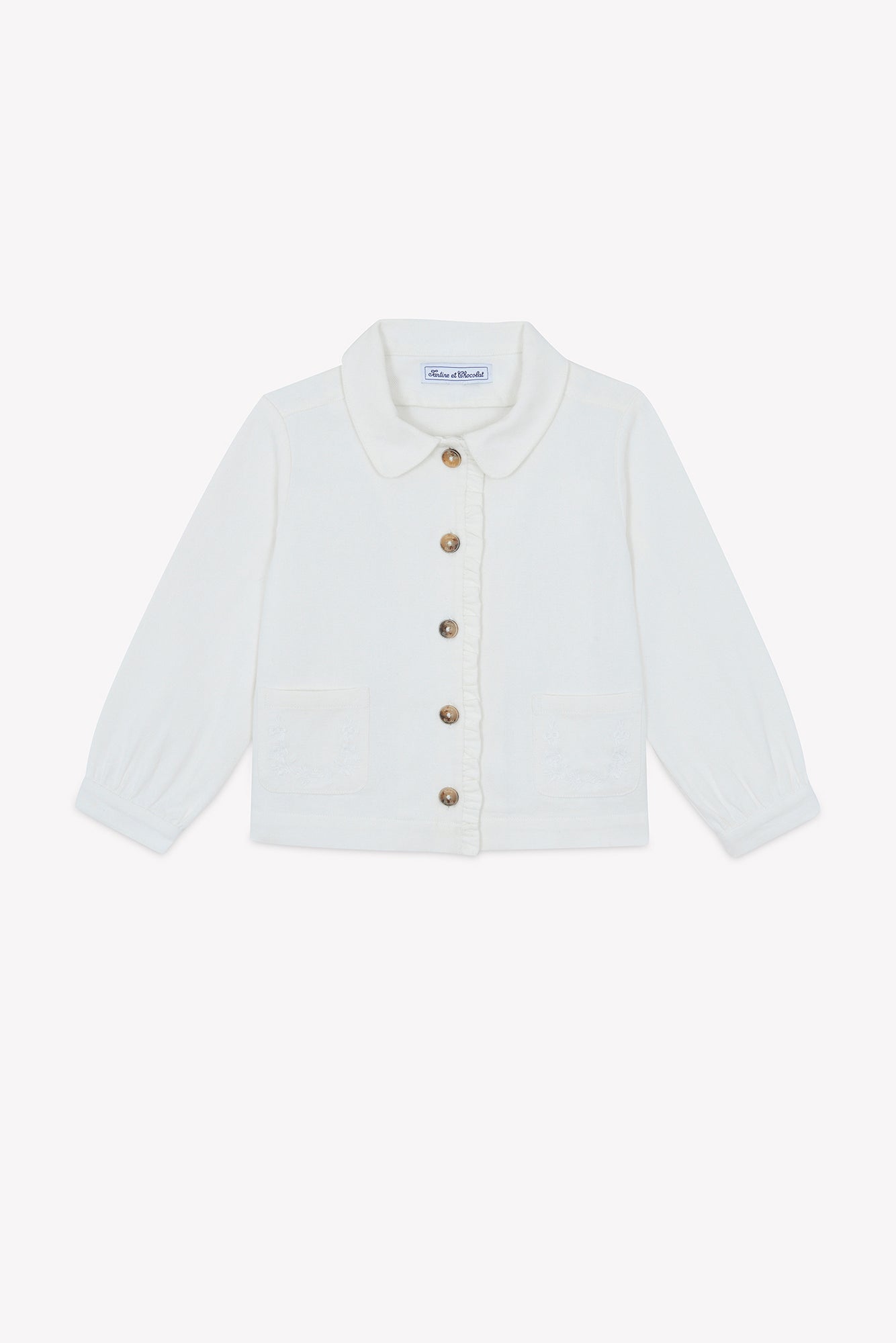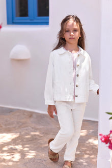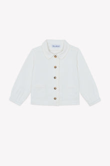 Questa giacca bianca in cotone, ispirata al tema "Country Club", è perfetta per le piccole esploratrici alla moda. Con il suo colletto a punta e le due tasche ricamate, dona un tocco di raffinatezza. Le maniche lunghe e i dettagli con frange aggiungono una nota di tendenza. Da abbinare a una gonna o a un pantalone per un look chic e comodo.